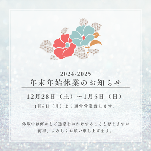 弊社では誠に勝手ながら、下記の期間におきまして休業とさせていただきます。 令和5年12月28日(土)~令和6年1月5日(日) 1月6日(月)より通常通り営業致します。 お客様にはご不便をおかけ致しますが、何卒ご了承賜りますようお願い申し上げます。